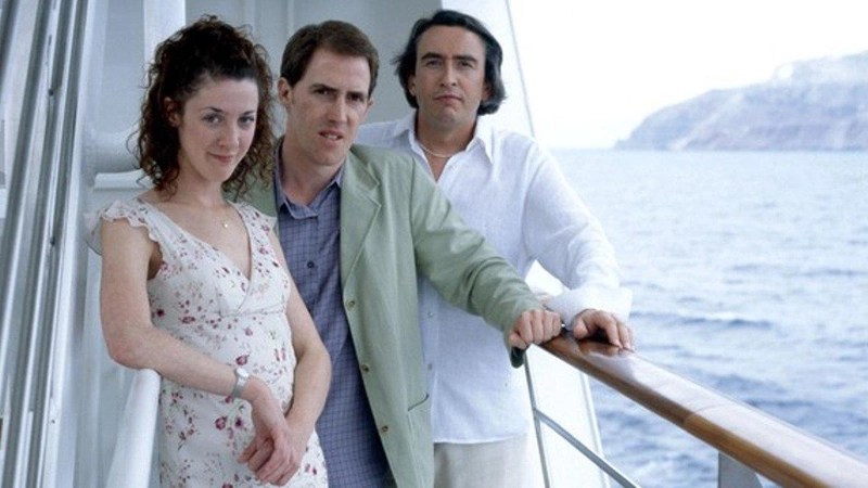 Amongst films and television that have depicted this are Staggered, G.B.H, Paul, Free Enterprise, Frasier, Community, The Big Bang Theory and most famously Galaxy Quest. Less well known but a marvelous example of this sub-genre is the 2002 TV movie Cruise of the Gods. Made by Baby Cow Productions for the BBC, it stars Rob Brydon and Steve Coogan as actors Andy Van Allen and Nick Lees. Both were the stars of an imaginary 80’s tv show Children of Castor. The show was set on a post-apocalyptic Earth, minus the USA (“America is Pollux!”) and featured a New Wave pop group who survived to become the inheritors of humanity. Now in 2002, Nick is globally famous for the US show Sherlock Holmes in Miami, whilst Andy is a barely working actor, supporting himself as a hotel porter. We learn that Andy has been a self-centred jerk most of his life. His lack of success and his resentful reliance on his cult fame has left him lonely and bitter. Most of the film takes place on a cruise ship taking holidaymakers, including a SF convention, around the Greek islands. Andy is the guest of honour, along with the show’s writer and a former actor who played a mutant in the opening credits. But his minor celebrity is overshadowed when Nick turns up completely by chance, filming the latest episode of his series. Andy is initially furious, but when Nick offers him a chance to appear in his programme, Andy sees an opportunity to finally become a star again.